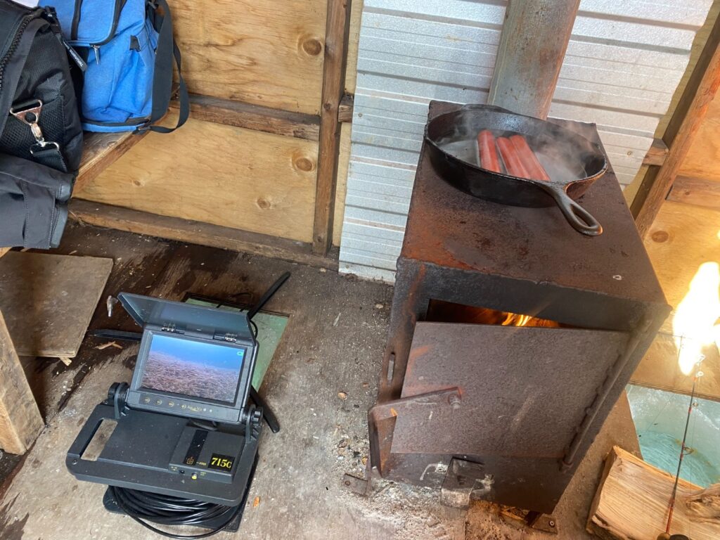 One of the best moments of the day had nothing to do with fishing. At lunch, we cooked hot dogs in a cast iron pan right on the woodstove inside the hut. Warm food, cold weather, and time together — those are the moments that turn a fishing trip into something you remember.
