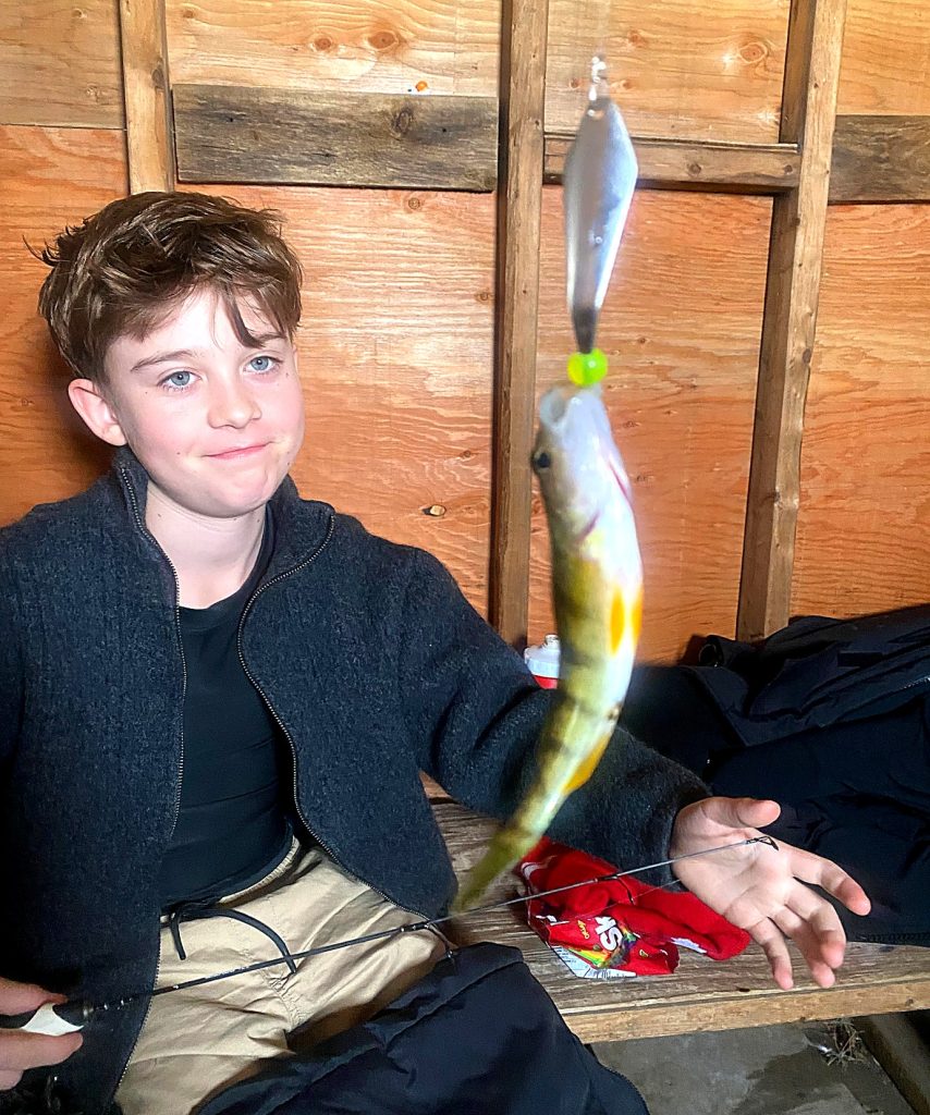 The yellow perch we caught were small, but that’s part of fishing — especially on first ice. When schools moved through, the action stayed steady enough to keep things interesting. I spent most of the day jigging a 2-inch Slab Grabber, purchased at Grimsby Tackle, while Joey fished live minnows, which is a great way to keep kids involved and learning how fish react under the ice.
